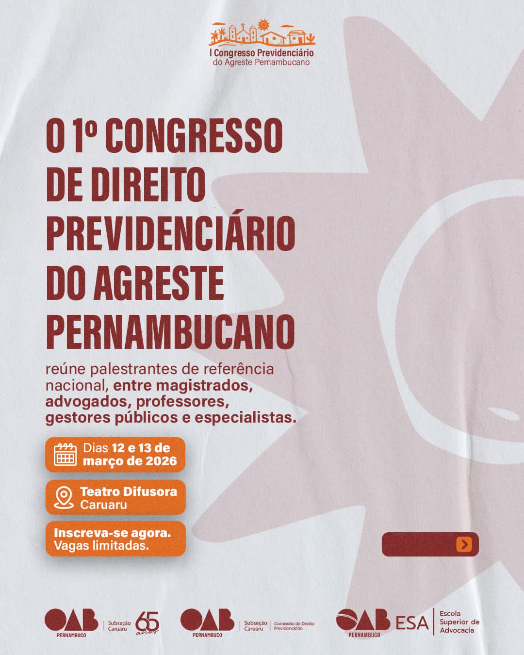 Caruaru será o centro do debate previdenciário nacional nos dias 12 e 13 de março de 2026, com a realização do 1º Congresso Previdenciário do Agreste Pernambucano, que reunirá grandes nomes do Direito Previdenciário brasileiro. O evento é uma realização da OAB Caruaru, por meio da Comissão de Direito Previdenciário, e homenageia o Dia do Advogado Previdenciário, celebrado em 10 de março.