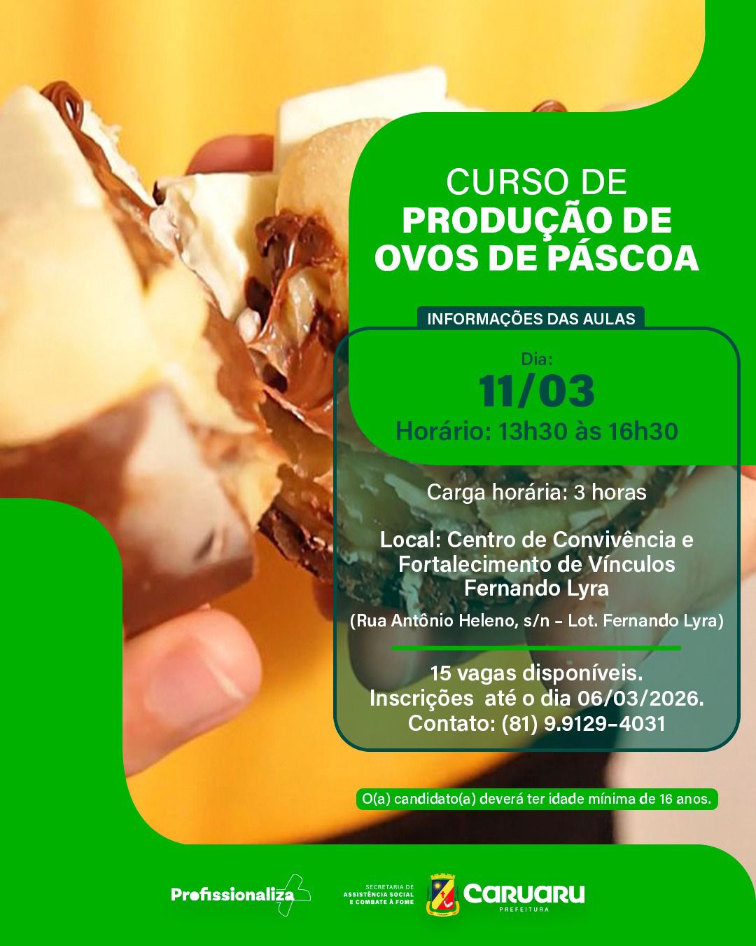 Estão abertas as inscrições para o curso gratuito de Produção de Ovos de Páscoa, voltado para quem deseja aprender técnicas de confeitaria e gerar renda no período da Páscoa.
