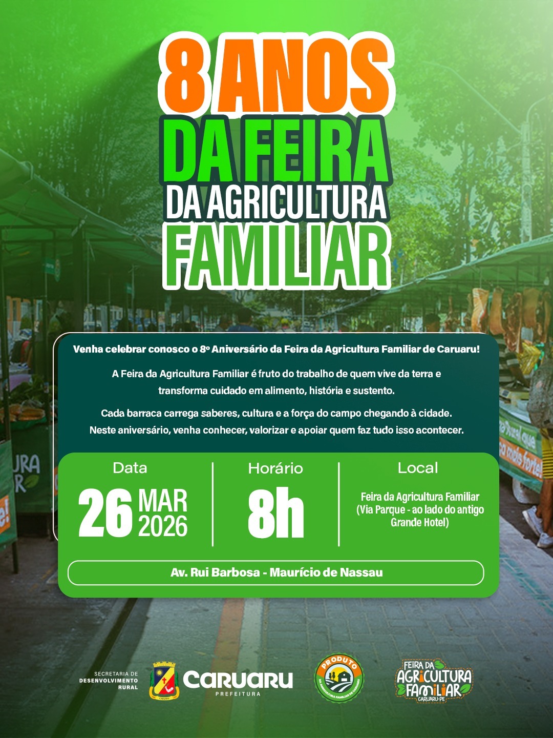A Feira da Agricultura Familiar de Caruaru celebra oito anos nesta quinta-feira (26). Para comemorar a data, uma programação especial está sendo realizada desde as 8h, na Feira da Via Parque. Terá entrega de sementes para agricultores, atividades educativas alusivas ao Dia Mundial da Água, entre outras.