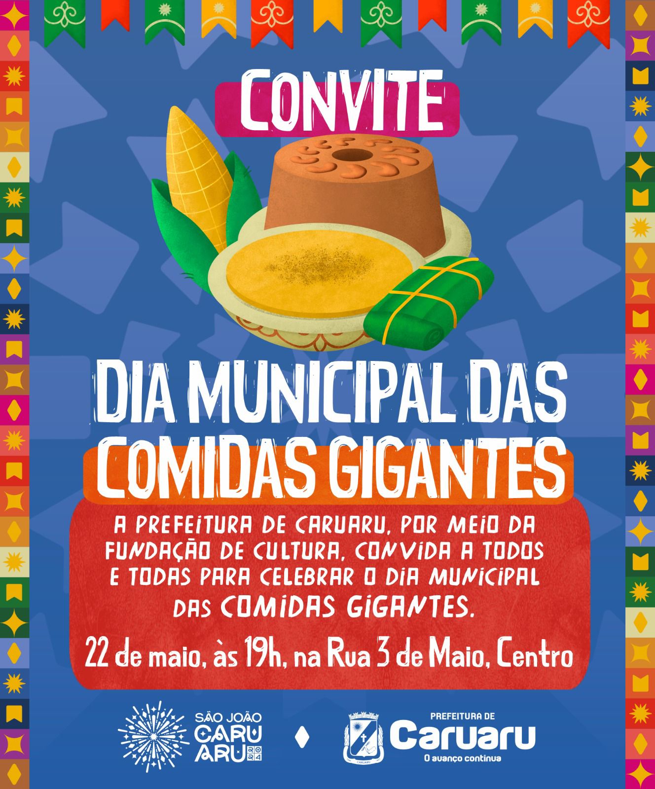 A Prefeitura de Caruaru, por meio da Fundação de Cultura, convida a todos e todas para o Dia Municipal das Comidas Gigantes, que será celebrado nesta quarta-feira (22), às 19h, na Rua 3 de Maio, Centro da cidade, próximo ao Monte Bom Jesus. Esta comemoração será realizada pelo segundo ano e conta com o envolvimento de mais de 60 comidas gigantes do nosso município. Para animar a festa, haverá apresentações culturais e musicais. Confira abaixo: