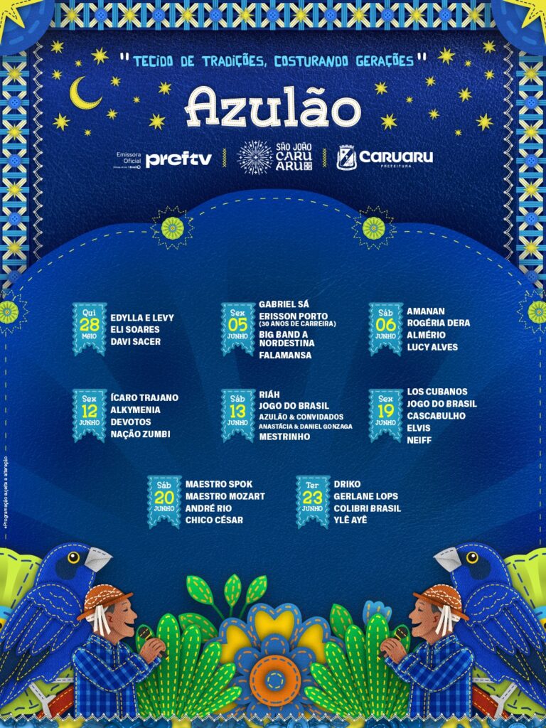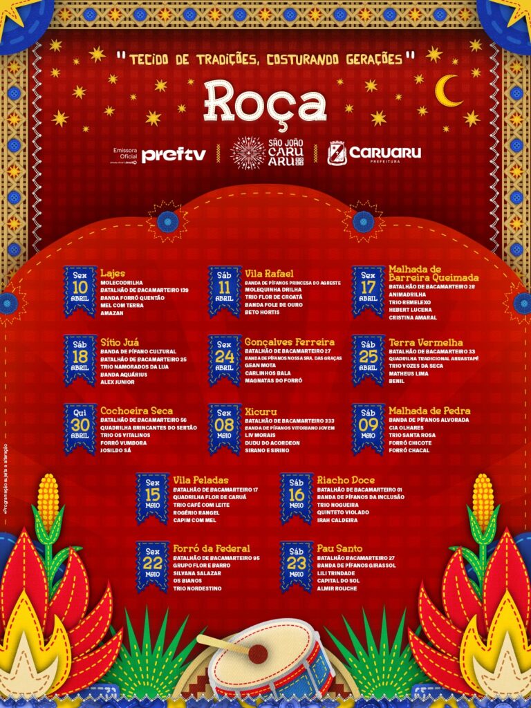 O calendário junino ganha reforço com as transmissões dos jogos do Brasil pela Copa do Mundo 2026, nos dias 13, 19 e 24 de junho. As partidas, que acontecem à noite, serão exibidas no Polo Azulão e no Pátio de Eventos, precedidas por matinês, unindo torcida e arrasta-pé em uma só programação.